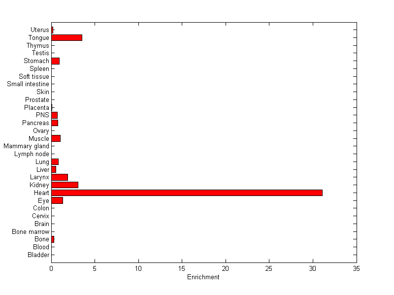 About the profile: The expression level is normalized with tissue-library size. Each value for a gene in a tissue is a ratio of observed ESTs to the expected one in this tissue. The expected number of ESTs is the product of total ESTs of the gene and the fraction of total ESTs in the tissue among all ESTs in 30 tissues. Summary: This gene is preferentially expressed in [heart] Download: |