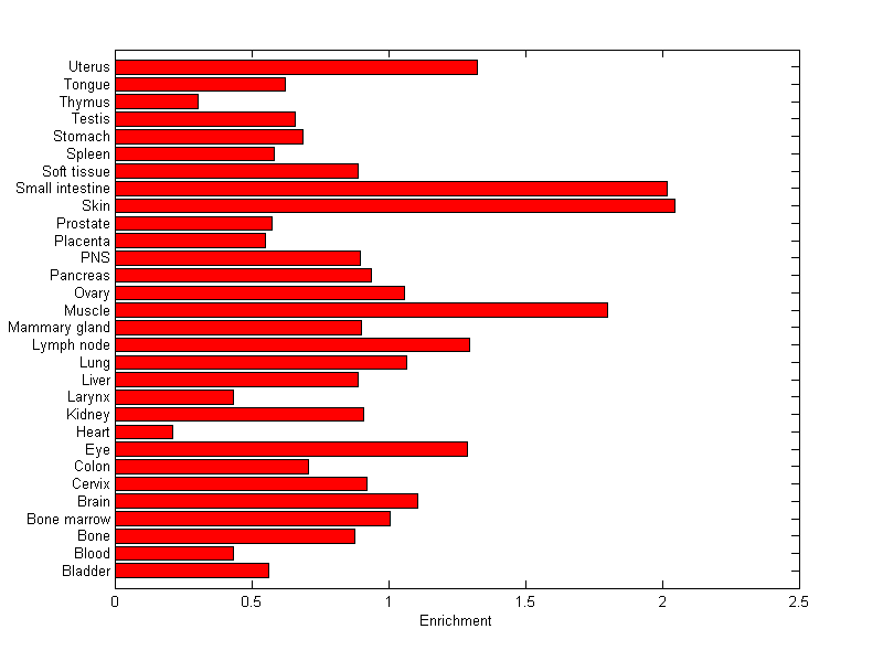 The expression level is normalized with tissue-library size. Each value for a gene in a tissue is a ratio of observed ESTs to the expected one in this tissue. The expected number of ESTs is the product of total ESTs of the gene and the fraction of total ESTs in the tissue among all ESTs in 30 tissues.
