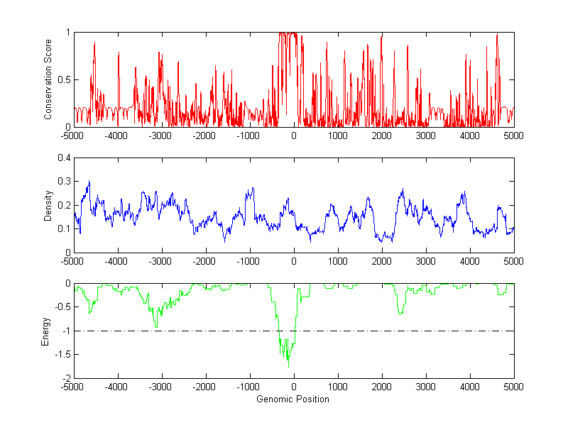The energy profile (green curve) is about energy for module detection based on TF interaction. The positions with energy less than -1 indicate the existence of CRMs.