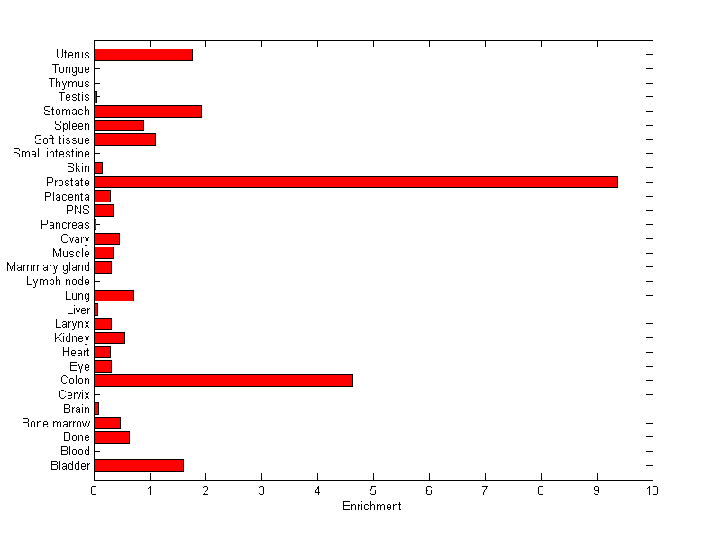 The expression level is normalized with tissue-library size. Each value for a gene in a tissue is a ratio of observed ESTs to the expected one in this tissue. The expected number of ESTs is the product of total ESTs of the gene and the fraction of total ESTs in the tissue among all ESTs in 30 tissues.
