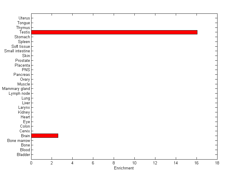 The expression level is normalized with tissue-library size. Each value for a gene in a tissue is a ratio of observed ESTs to the expected one in this tissue. The expected number of ESTs is the product of total ESTs of the gene and the fraction of total ESTs in the tissue among all ESTs in 30 tissues.