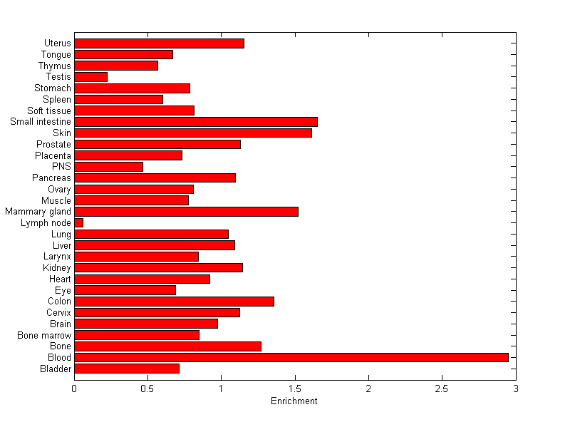 The expression level is normalized with tissue-library size. Each value for a gene in a tissue is a ratio of observed ESTs to the expected one in this tissue. The expected number of ESTs is the product of total ESTs of the gene and the fraction of total ESTs in the tissue among all ESTs in 30 tissues.