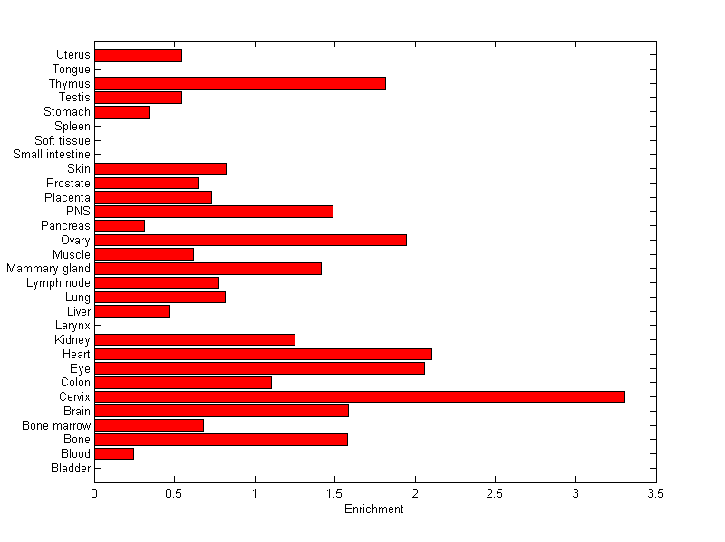 The expression level is normalized with tissue-library size. Each value for a gene in a tissue is a ratio of observed ESTs to the expected one in this tissue. The expected number of ESTs is the product of total ESTs of the gene and the fraction of total ESTs in the tissue among all ESTs in 30 tissues.