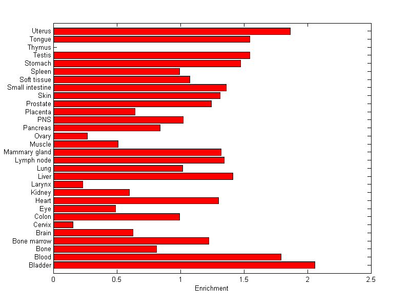 The expression level is normalized with tissue-library size. Each value for a gene in a tissue is a ratio of observed ESTs to the expected one in this tissue. The expected number of ESTs is the product of total ESTs of the gene and the fraction of total ESTs in the tissue among all ESTs in 30 tissues.