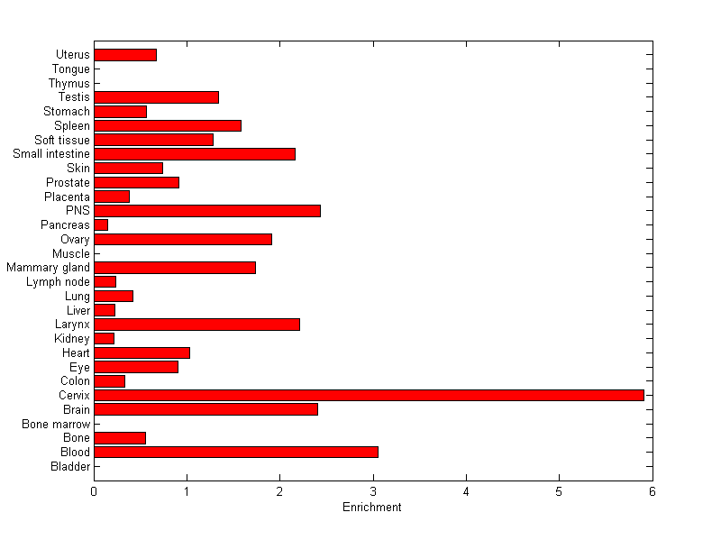 The expression level is normalized with tissue-library size. Each value for a gene in a tissue is a ratio of observed ESTs to the expected one in this tissue. The expected number of ESTs is the product of total ESTs of the gene and the fraction of total ESTs in the tissue among all ESTs in 30 tissues.
