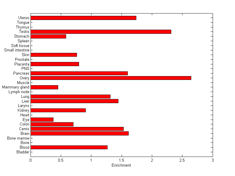 The expression level is normalized with tissue-library size. Each value for a gene in a tissue is a ratio of observed ESTs to the expected one in this tissue. The expected number of ESTs is the product of total ESTs of the gene and the fraction of total ESTs in the tissue among all ESTs in 30 tissues.