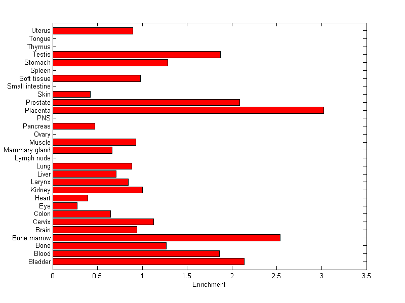 The expression level is normalized with tissue-library size. Each value for a gene in a tissue is a ratio of observed ESTs to the expected one in this tissue. The expected number of ESTs is the product of total ESTs of the gene and the fraction of total ESTs in the tissue among all ESTs in 30 tissues.