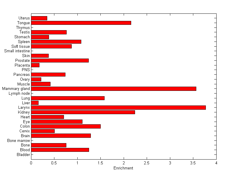The expression level is normalized with tissue-library size. Each value for a gene in a tissue is a ratio of observed ESTs to the expected one in this tissue. The expected number of ESTs is the product of total ESTs of the gene and the fraction of total ESTs in the tissue among all ESTs in 30 tissues.