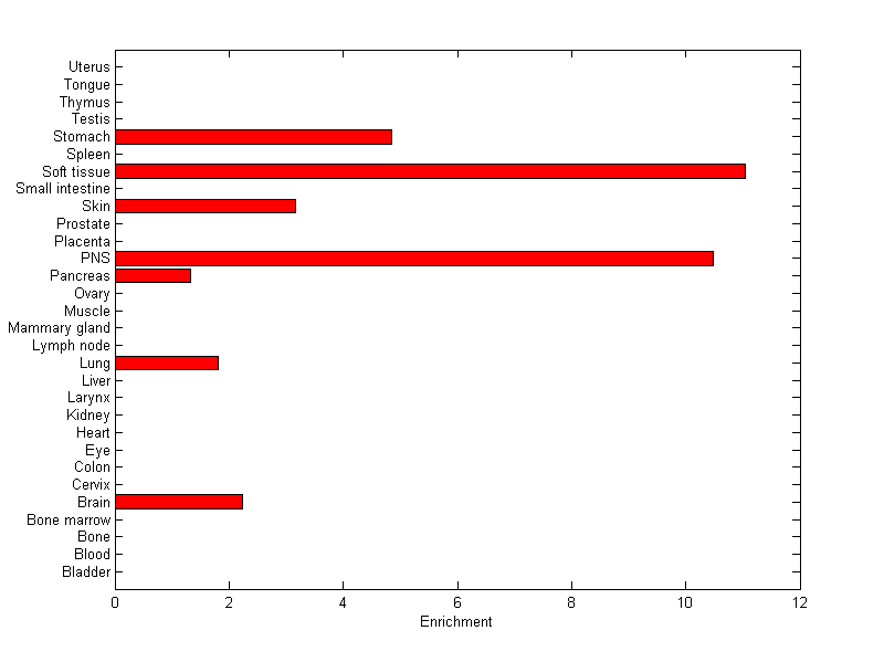 The expression level is normalized with tissue-library size. Each value for a gene in a tissue is a ratio of observed ESTs to the expected one in this tissue. The expected number of ESTs is the product of total ESTs of the gene and the fraction of total ESTs in the tissue among all ESTs in 30 tissues.