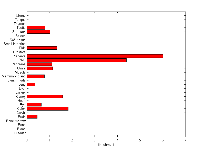 The expression level is normalized with tissue-library size. Each value for a gene in a tissue is a ratio of observed ESTs to the expected one in this tissue. The expected number of ESTs is the product of total ESTs of the gene and the fraction of total ESTs in the tissue among all ESTs in 30 tissues.
