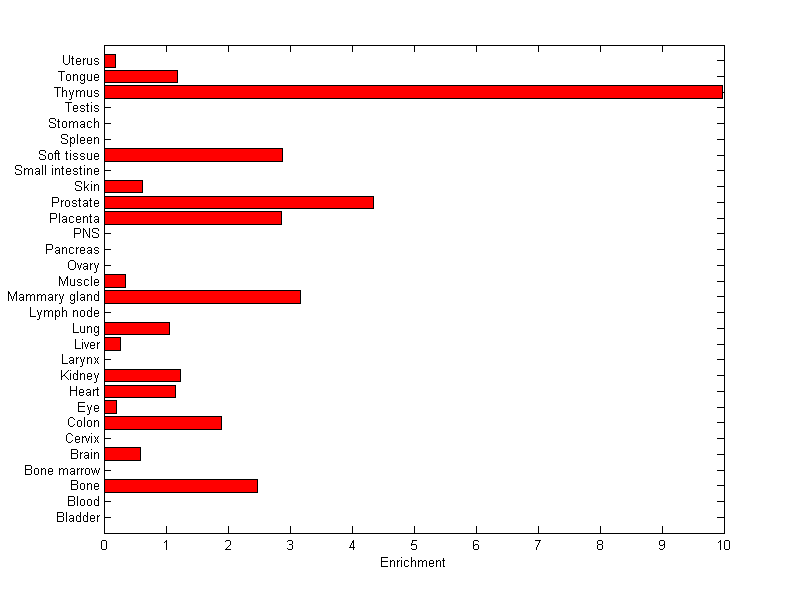The expression level is normalized with tissue-library size. Each value for a gene in a tissue is a ratio of observed ESTs to the expected one in this tissue. The expected number of ESTs is the product of total ESTs of the gene and the fraction of total ESTs in the tissue among all ESTs in 30 tissues.