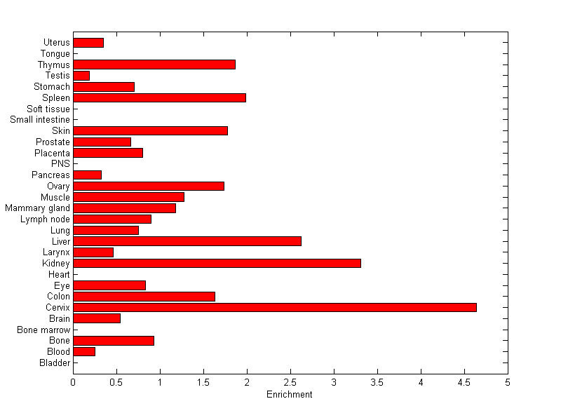 The expression level is normalized with tissue-library size. Each value for a gene in a tissue is a ratio of observed ESTs to the expected one in this tissue. The expected number of ESTs is the product of total ESTs of the gene and the fraction of total ESTs in the tissue among all ESTs in 30 tissues.