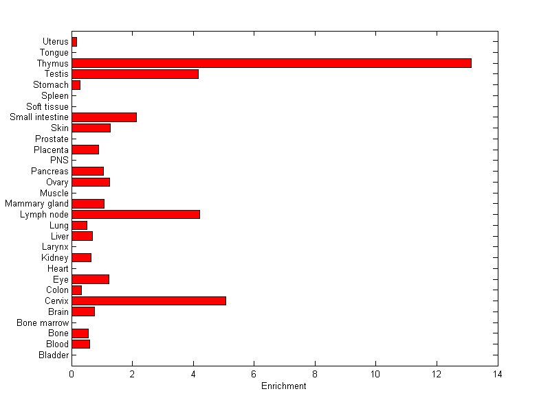 The expression level is normalized with tissue-library size. Each value for a gene in a tissue is a ratio of observed ESTs to the expected one in this tissue. The expected number of ESTs is the product of total ESTs of the gene and the fraction of total ESTs in the tissue among all ESTs in 30 tissues.