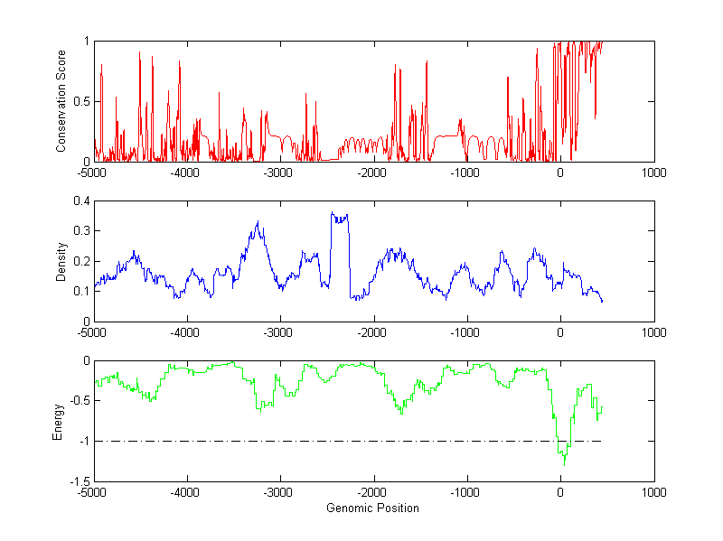 The conservation profile (red curve) is about conservation scores of the promoter sequences. Conservation was determined from an eight-way alignment of human, chimpanzee, dog, mouse, rat, chicken, zebrafish and fugu sequences. The conservation was quantified by a conservation score between 0 and 1, with 1 as highest conservation. The conservation score was obtained from UCSC genome databases.