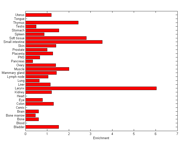 The expression level is normalized with tissue-library size. Each value for a gene in a tissue is a ratio of observed ESTs to the expected one in this tissue. The expected number of ESTs is the product of total ESTs of the gene and the fraction of total ESTs in the tissue among all ESTs in 30 tissues.