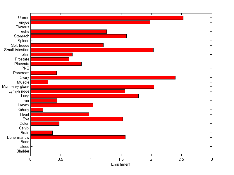 The expression level is normalized with tissue-library size. Each value for a gene in a tissue is a ratio of observed ESTs to the expected one in this tissue. The expected number of ESTs is the product of total ESTs of the gene and the fraction of total ESTs in the tissue among all ESTs in 30 tissues.