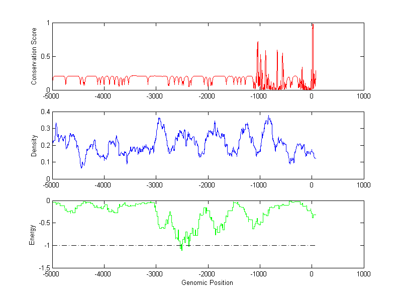 The conservation profile (red curve) is about conservation scores of the promoter sequences. Conservation was determined from an eight-way alignment of human, chimpanzee, dog, mouse, rat, chicken, zebrafish and fugu sequences. The conservation was quantified by a conservation score between 0 and 1, with 1 as highest conservation. The conservation score was obtained from UCSC genome databases.