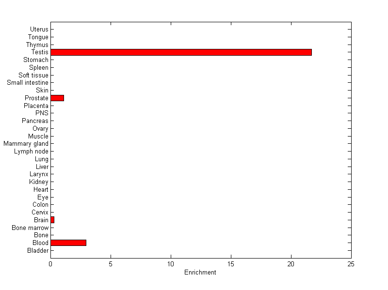 The expression level is normalized with tissue-library size. Each value for a gene in a tissue is a ratio of observed ESTs to the expected one in this tissue. The expected number of ESTs is the product of total ESTs of the gene and the fraction of total ESTs in the tissue among all ESTs in 30 tissues.