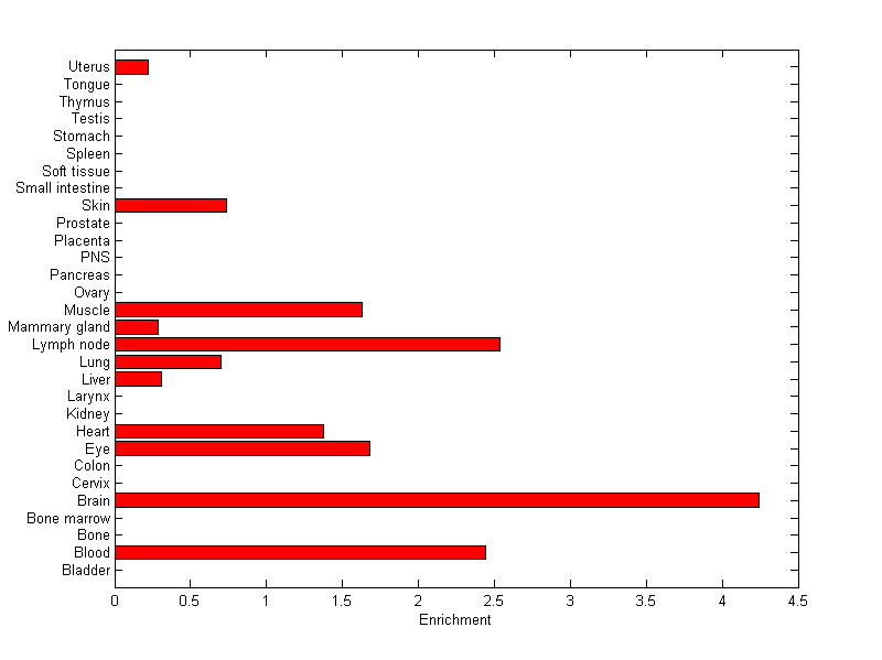 The expression level is normalized with tissue-library size. Each value for a gene in a tissue is a ratio of observed ESTs to the expected one in this tissue. The expected number of ESTs is the product of total ESTs of the gene and the fraction of total ESTs in the tissue among all ESTs in 30 tissues.