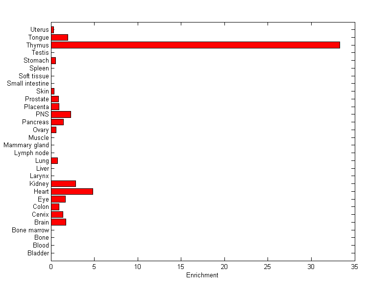 The expression level is normalized with tissue-library size. Each value for a gene in a tissue is a ratio of observed ESTs to the expected one in this tissue. The expected number of ESTs is the product of total ESTs of the gene and the fraction of total ESTs in the tissue among all ESTs in 30 tissues.
