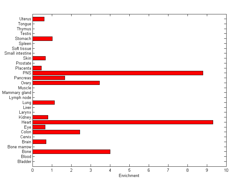 The expression level is normalized with tissue-library size. Each value for a gene in a tissue is a ratio of observed ESTs to the expected one in this tissue. The expected number of ESTs is the product of total ESTs of the gene and the fraction of total ESTs in the tissue among all ESTs in 30 tissues.