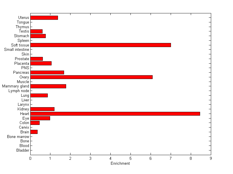 About the profile: The expression level is normalized with tissue-library size. Each value for a gene in a tissue is a ratio of observed ESTs to the expected one in this tissue. The expected number of ESTs is the product of total ESTs of the gene and the fraction of total ESTs in the tissue among all ESTs in 30 tissues. Summary: This gene is preferentially expressed in [heart, ovary] Download: |