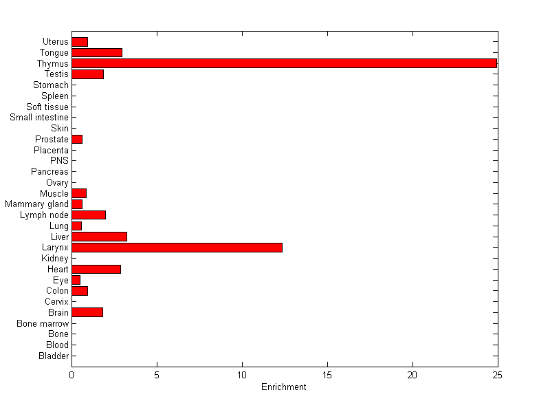 The expression level is normalized with tissue-library size. Each value for a gene in a tissue is a ratio of observed ESTs to the expected one in this tissue. The expected number of ESTs is the product of total ESTs of the gene and the fraction of total ESTs in the tissue among all ESTs in 30 tissues.