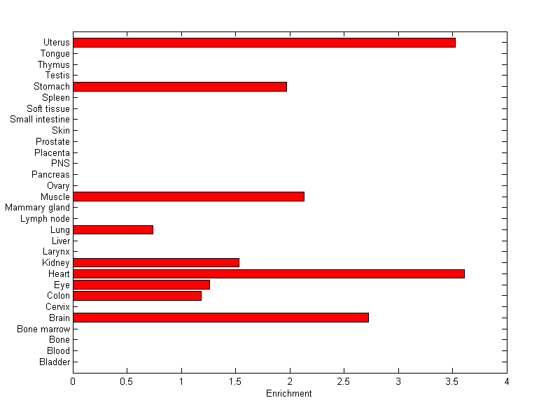 The expression level is normalized with tissue-library size. Each value for a gene in a tissue is a ratio of observed ESTs to the expected one in this tissue. The expected number of ESTs is the product of total ESTs of the gene and the fraction of total ESTs in the tissue among all ESTs in 30 tissues.