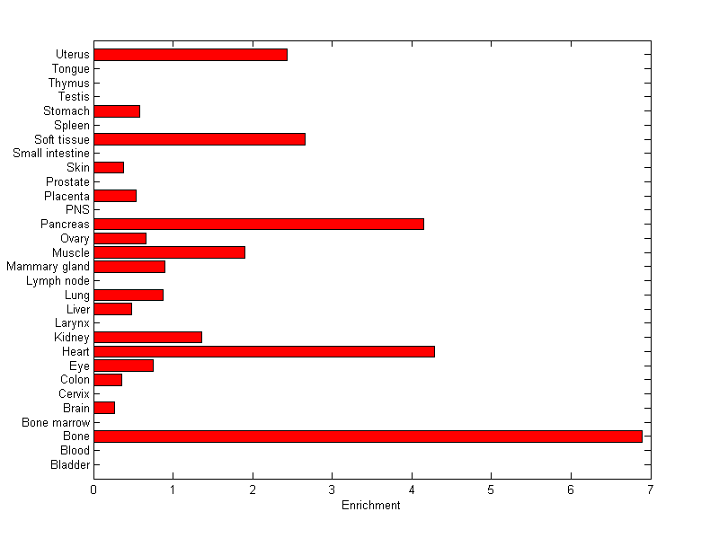 The expression level is normalized with tissue-library size. Each value for a gene in a tissue is a ratio of observed ESTs to the expected one in this tissue. The expected number of ESTs is the product of total ESTs of the gene and the fraction of total ESTs in the tissue among all ESTs in 30 tissues.