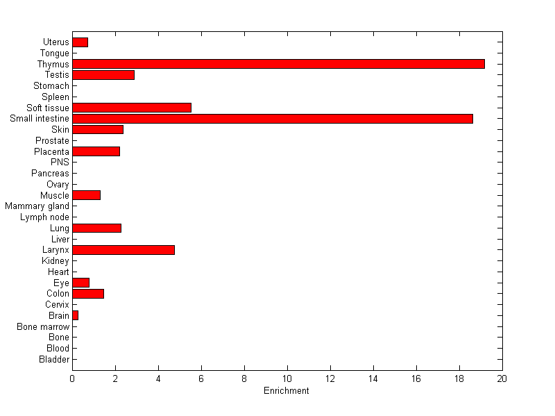 The expression level is normalized with tissue-library size. Each value for a gene in a tissue is a ratio of observed ESTs to the expected one in this tissue. The expected number of ESTs is the product of total ESTs of the gene and the fraction of total ESTs in the tissue among all ESTs in 30 tissues.