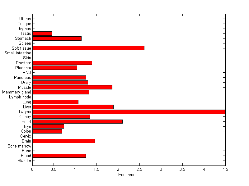 The expression level is normalized with tissue-library size. Each value for a gene in a tissue is a ratio of observed ESTs to the expected one in this tissue. The expected number of ESTs is the product of total ESTs of the gene and the fraction of total ESTs in the tissue among all ESTs in 30 tissues.