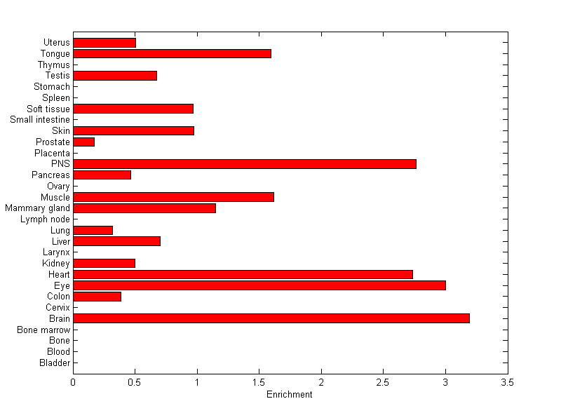 The expression level is normalized with tissue-library size. Each value for a gene in a tissue is a ratio of observed ESTs to the expected one in this tissue. The expected number of ESTs is the product of total ESTs of the gene and the fraction of total ESTs in the tissue among all ESTs in 30 tissues.
