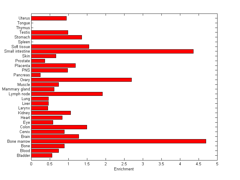 The expression level is normalized with tissue-library size. Each value for a gene in a tissue is a ratio of observed ESTs to the expected one in this tissue. The expected number of ESTs is the product of total ESTs of the gene and the fraction of total ESTs in the tissue among all ESTs in 30 tissues.