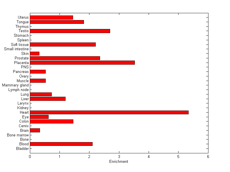 The expression level is normalized with tissue-library size. Each value for a gene in a tissue is a ratio of observed ESTs to the expected one in this tissue. The expected number of ESTs is the product of total ESTs of the gene and the fraction of total ESTs in the tissue among all ESTs in 30 tissues.