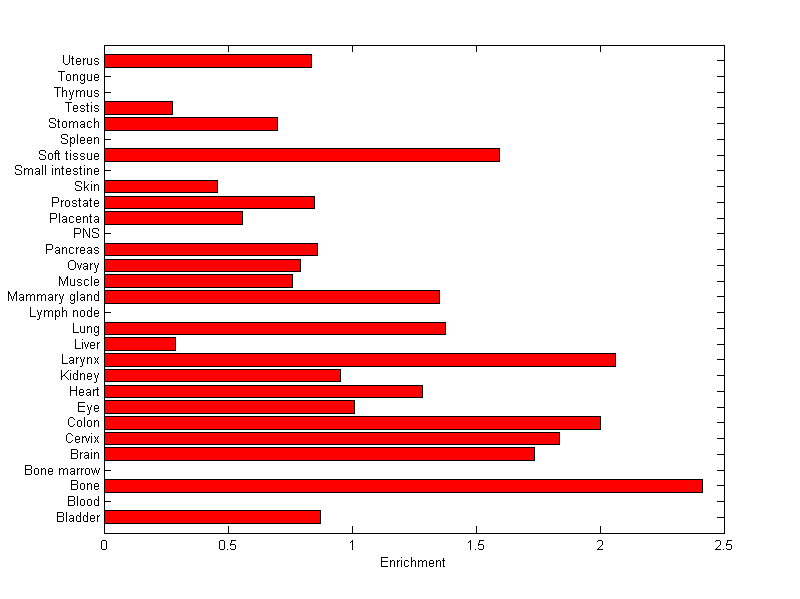 The expression level is normalized with tissue-library size. Each value for a gene in a tissue is a ratio of observed ESTs to the expected one in this tissue. The expected number of ESTs is the product of total ESTs of the gene and the fraction of total ESTs in the tissue among all ESTs in 30 tissues.