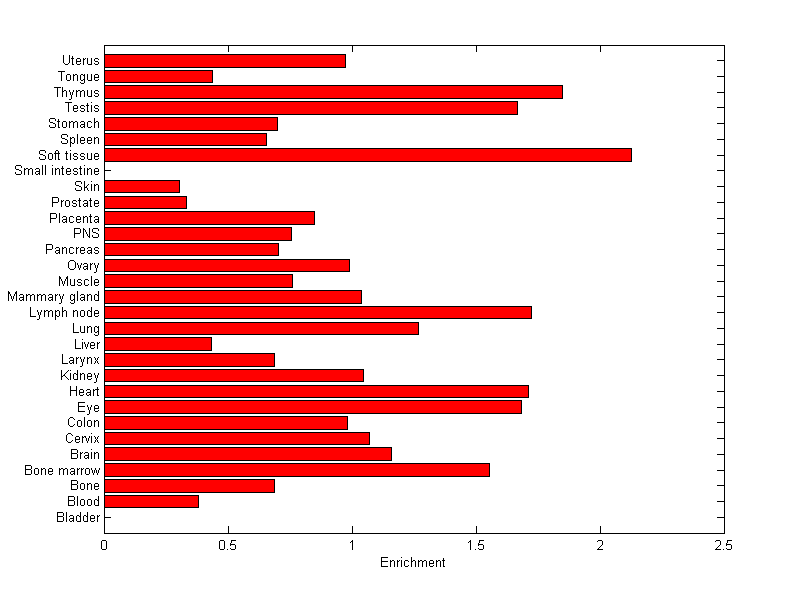 The expression level is normalized with tissue-library size. Each value for a gene in a tissue is a ratio of observed ESTs to the expected one in this tissue. The expected number of ESTs is the product of total ESTs of the gene and the fraction of total ESTs in the tissue among all ESTs in 30 tissues.