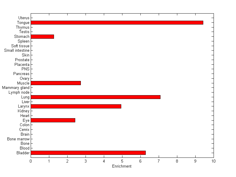 The expression level is normalized with tissue-library size. Each value for a gene in a tissue is a ratio of observed ESTs to the expected one in this tissue. The expected number of ESTs is the product of total ESTs of the gene and the fraction of total ESTs in the tissue among all ESTs in 30 tissues.