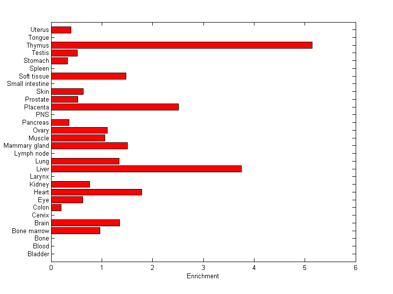 The expression level is normalized with tissue-library size. Each value for a gene in a tissue is a ratio of observed ESTs to the expected one in this tissue. The expected number of ESTs is the product of total ESTs of the gene and the fraction of total ESTs in the tissue among all ESTs in 30 tissues.