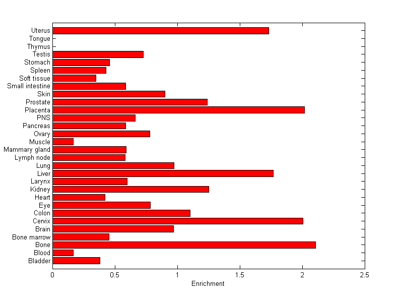 The expression level is normalized with tissue-library size. Each value for a gene in a tissue is a ratio of observed ESTs to the expected one in this tissue. The expected number of ESTs is the product of total ESTs of the gene and the fraction of total ESTs in the tissue among all ESTs in 30 tissues.