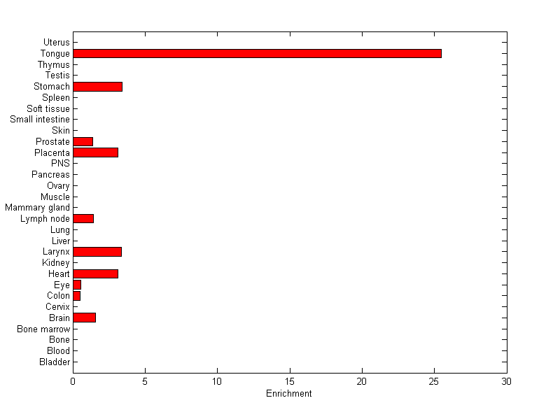The expression level is normalized with tissue-library size. Each value for a gene in a tissue is a ratio of observed ESTs to the expected one in this tissue. The expected number of ESTs is the product of total ESTs of the gene and the fraction of total ESTs in the tissue among all ESTs in 30 tissues.