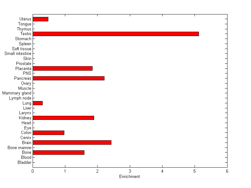 The expression level is normalized with tissue-library size. Each value for a gene in a tissue is a ratio of observed ESTs to the expected one in this tissue. The expected number of ESTs is the product of total ESTs of the gene and the fraction of total ESTs in the tissue among all ESTs in 30 tissues.