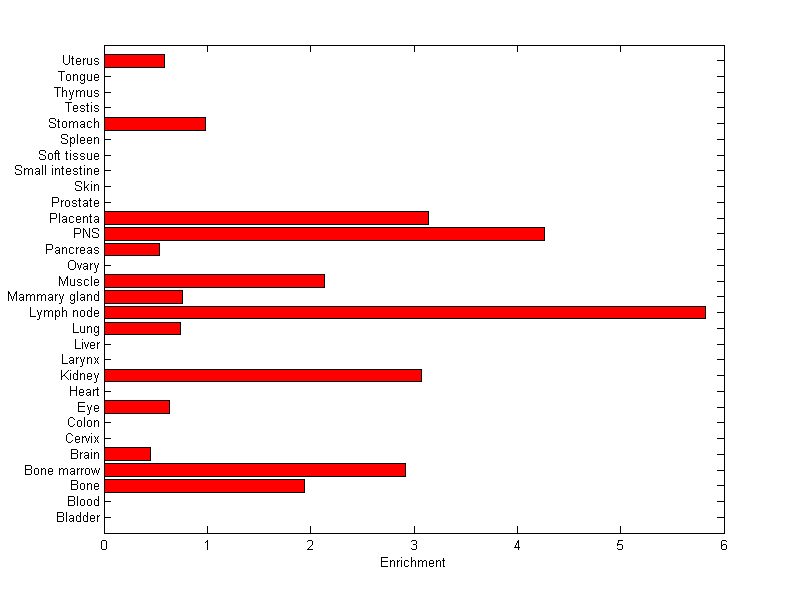 The expression level is normalized with tissue-library size. Each value for a gene in a tissue is a ratio of observed ESTs to the expected one in this tissue. The expected number of ESTs is the product of total ESTs of the gene and the fraction of total ESTs in the tissue among all ESTs in 30 tissues.