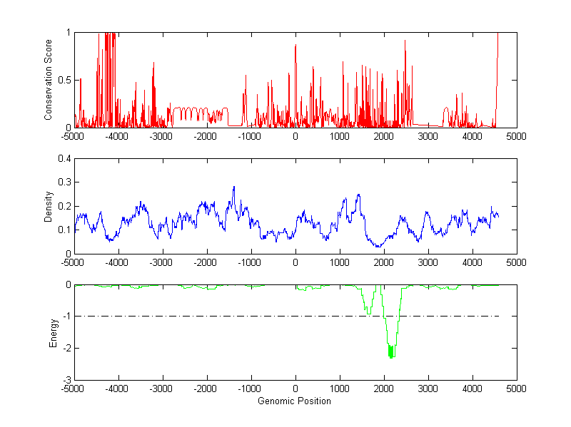 The energy profile (green curve) is about energy for module detection based on TF interaction. The positions with energy less than -1 indicate the existence of CRMs.