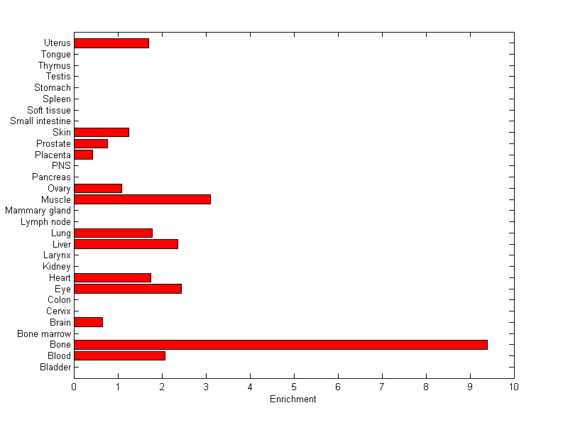 The expression level is normalized with tissue-library size. Each value for a gene in a tissue is a ratio of observed ESTs to the expected one in this tissue. The expected number of ESTs is the product of total ESTs of the gene and the fraction of total ESTs in the tissue among all ESTs in 30 tissues.