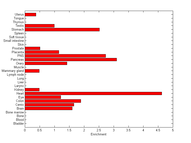 The expression level is normalized with tissue-library size. Each value for a gene in a tissue is a ratio of observed ESTs to the expected one in this tissue. The expected number of ESTs is the product of total ESTs of the gene and the fraction of total ESTs in the tissue among all ESTs in 30 tissues.