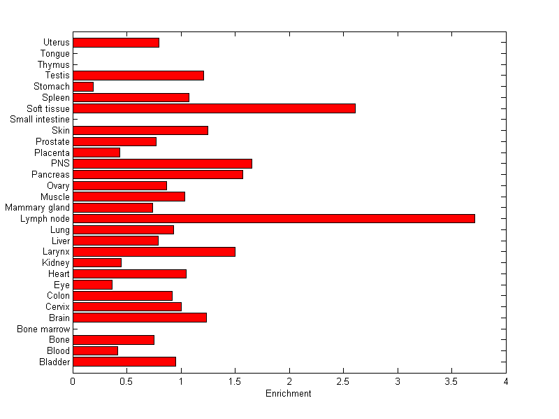 The expression level is normalized with tissue-library size. Each value for a gene in a tissue is a ratio of observed ESTs to the expected one in this tissue. The expected number of ESTs is the product of total ESTs of the gene and the fraction of total ESTs in the tissue among all ESTs in 30 tissues.