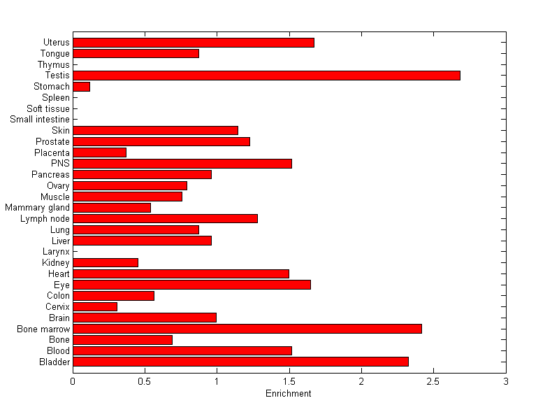 The expression level is normalized with tissue-library size. Each value for a gene in a tissue is a ratio of observed ESTs to the expected one in this tissue. The expected number of ESTs is the product of total ESTs of the gene and the fraction of total ESTs in the tissue among all ESTs in 30 tissues.