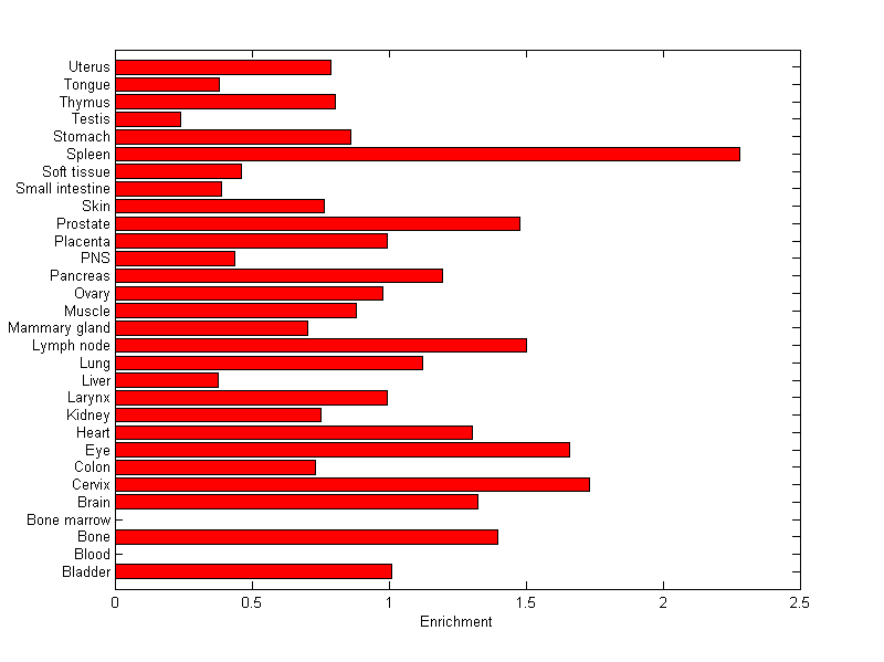 The expression level is normalized with tissue-library size. Each value for a gene in a tissue is a ratio of observed ESTs to the expected one in this tissue. The expected number of ESTs is the product of total ESTs of the gene and the fraction of total ESTs in the tissue among all ESTs in 30 tissues.