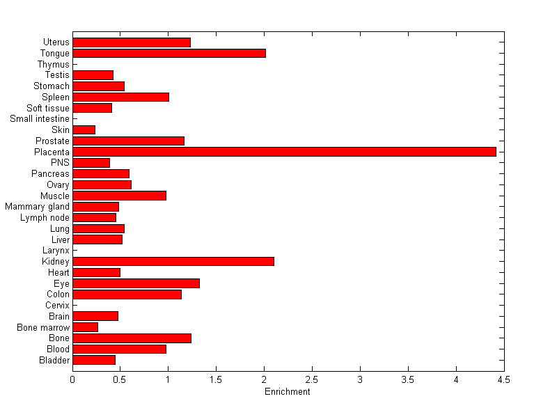The expression level is normalized with tissue-library size. Each value for a gene in a tissue is a ratio of observed ESTs to the expected one in this tissue. The expected number of ESTs is the product of total ESTs of the gene and the fraction of total ESTs in the tissue among all ESTs in 30 tissues.
