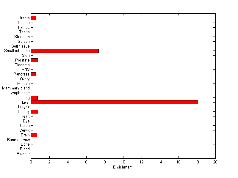 The expression level is normalized with tissue-library size. Each value for a gene in a tissue is a ratio of observed ESTs to the expected one in this tissue. The expected number of ESTs is the product of total ESTs of the gene and the fraction of total ESTs in the tissue among all ESTs in 30 tissues.